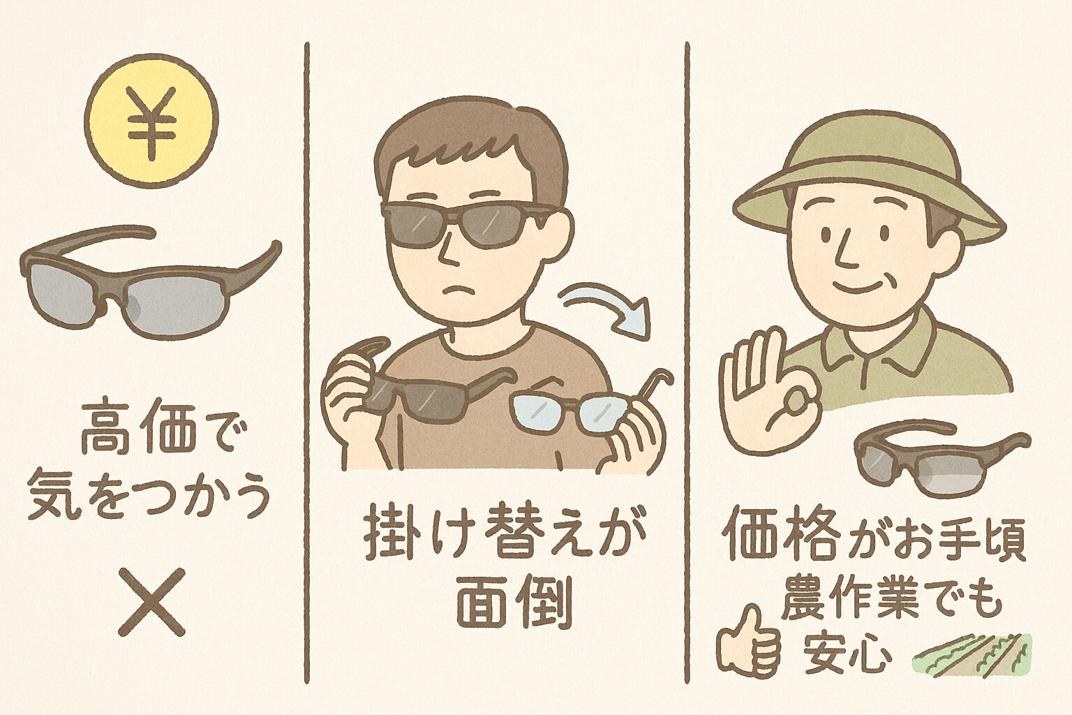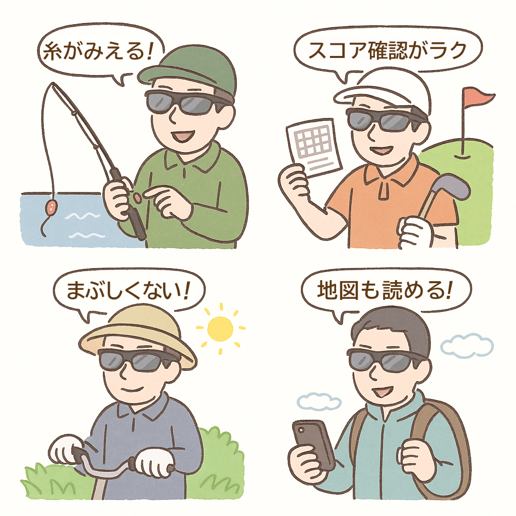 - ■普通のサングラス:まぶしさ対策はできるが、手元が見えず不便