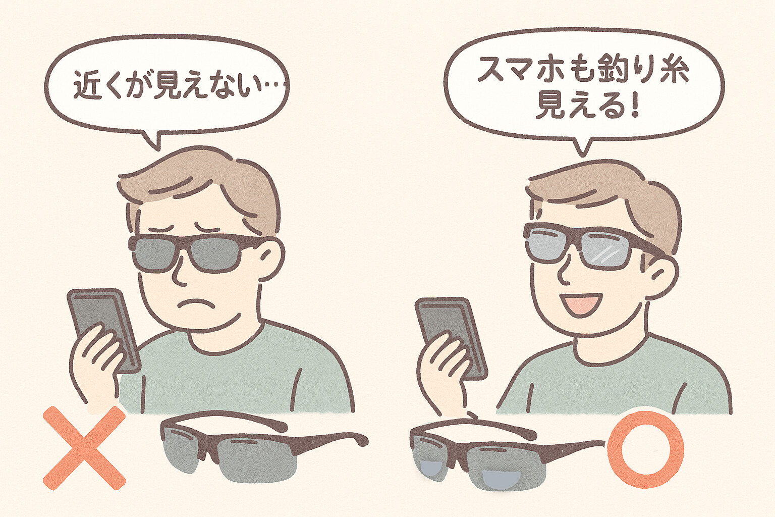 レンズ下部に老眼用ゾーンを配置。スマホ・スコア表・仕掛け作業がスムーズ。